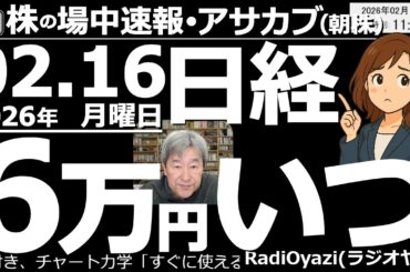 MONEY 2026-02-16 【朝株!(投資情報)】今日の日経平均は売り優勢。今週は、もしかしたら「調整ウイーク」になるかもしれないが、今の相場「調整は買いチャンス」の可能性が高い。3月中旬には日経6万円?積極投資のスタンス持続。【…